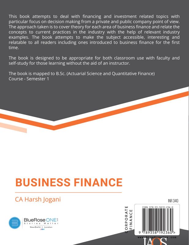About the Book: This book attempts to deal with financing and investment-related topics with a particular focus on decision-making from a private and public company point of view. The approach taken is to cover theory for each area of business finance and relate the concepts to current practices in the industry with the help of relevant industry examplesThe book attempts to make the subject accessible, interesting, and relatable to all readers including ones introduced to business finance for the first time. The book is designed to be appropriate for both classroom use with faculty and self-study for those learning without the aid of an instructor. The book is mapped to B.Sc(Actuarial Science and Quantitative Finance) Course – Semester 1.
