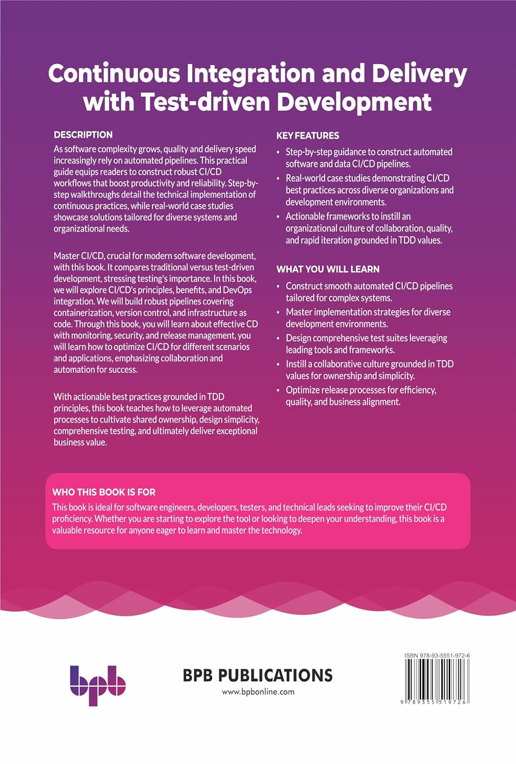 As software complexity grows, quality and delivery speed increasingly rely on automated pipelines. This practical guide equips readers to construct robust CI/CD workflows that boost productivity and reliability. Step-by-step walkthroughs detail the technical implementation of continuous practices, while real-world case studies showcase solutions tailored for diverse systems and organizational needs. Master CI/CD, crucial for modern software development, with this book. It compares traditional versus test-driven development, stressing testing’s importance. In this book, we will explore CI/CD’s principles, benefits, and DevOps integration. We will build robust pipelines covering containerization, version control, and infrastructure as code. Through this book, you will learn about effective CD with monitoring, security, and release management, you will learn how to optimize CI/CD for different scenarios and applications, emphasizing collaboration and automation for success.