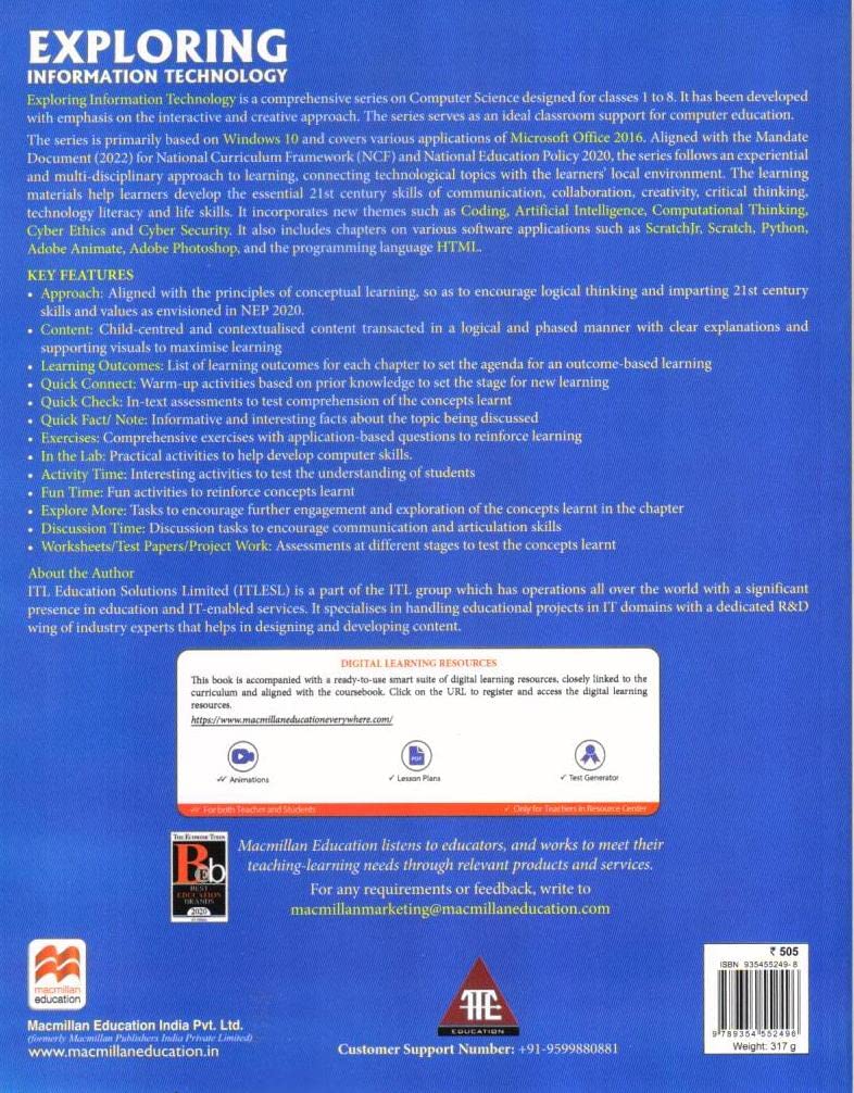 Exploring Information Technology is a comprehensive and engaging series designed for classes 1-8 to introduce young learners to the world of Computer Science. Aligned with the National Education Policy (NEP) 2020, the series focuses on providing an interactive and creative approach to computer education, making it an ideal classroom support resource. Covering essential software applications such as Windows 10, MS Office 2016, ScratchJr, Scratch, Python, Adobe Animate, Adobe Photoshop, and HTML, this series aims to equip students with the skills required for today’s technology-driven world.