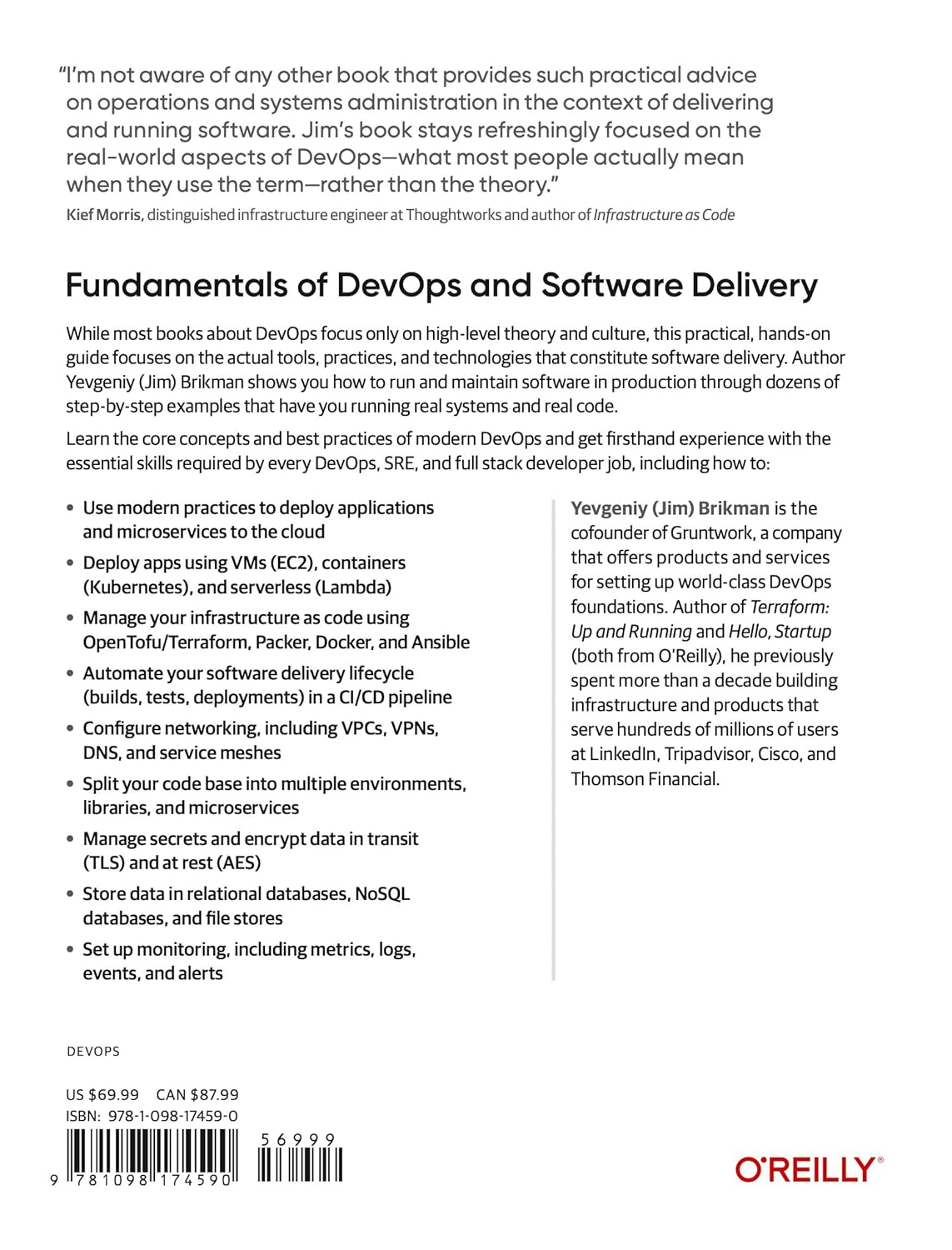 This book is a guide to DevOps and software delivery: that is, a guide to the numerous tools and techniques that are required to take that application code and run it and maintain it in production, where it can generate value for your users and your company on an ongoing basis. This includes going through all the modern practices for deploying applications and microservices to the cloud, managing your infrastructure as code, automating your software delivery lifecycle in a CI/CD pipeline, configuring networking, setting up data stores, and hooking up monitoring.
