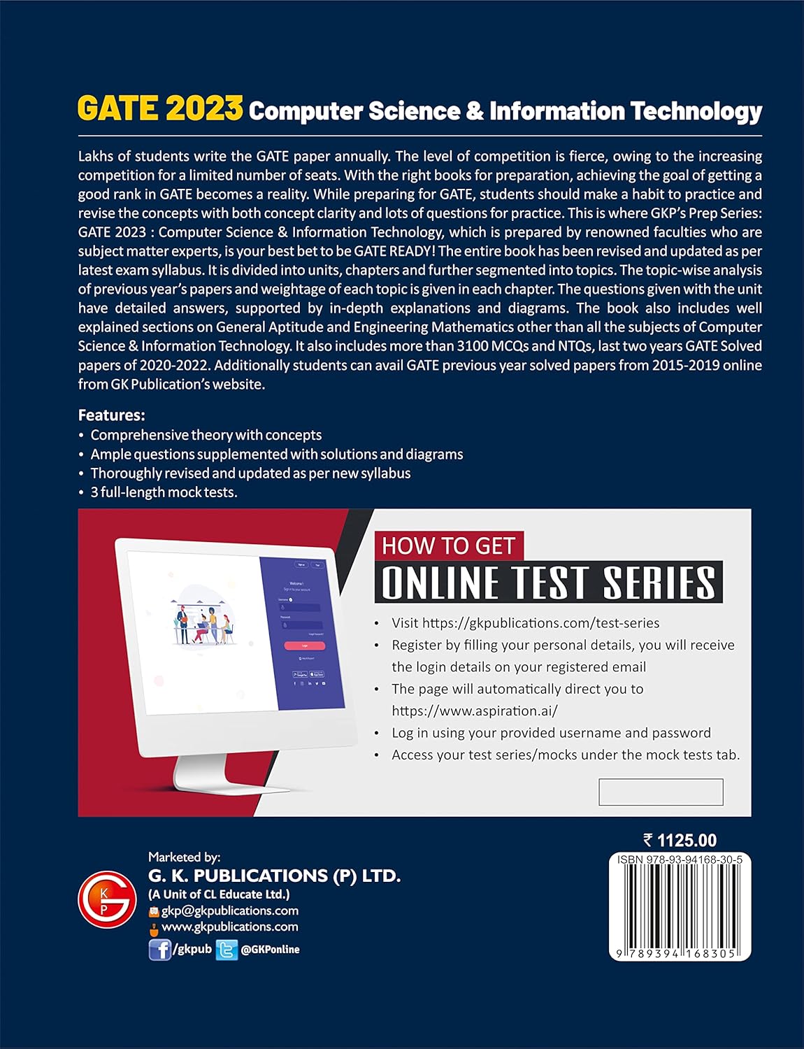 Lakhs of students write the GATE paper annually. The level of competition is fierce, owing to the increasing competition for a limited number of seats. With the right books for preparation, achieving the goal of getting a good rank in GATE becomes a reality. While preparing for GATE, students should make a habit to practice and revise the concepts with both concept clarity and lots of questions for practice. This is where GKP’s Prep Series: GATE 2023 : Computer Science & Information Technology, which is prepared by renowned faculties who are subject matter experts, is your best bet to be GATE READY! The entire book has been revised and updated as per latest exam syllabus. It is divided into units, chapters and further segmented into topics. The topic-wise analysis of previous year’s papers and weightage of each topic is given in each chapter. The questions given with the unit have detailed answers, supported by in-depth explanations and diagrams. The book also includes well explained sections on General Aptitude and Engineering Mathematics other than all the subjects of Computer Science & Information Technology. It also includes more than 3100 MCQs and NTQs, last two years GATE Solved papers of 2020-2022. Additionally students can avail GATE previous year solved papers from 2015-2019 online from GK Publication’s website. Features: Comprehensive theory with concepts Ample questions supplemented with solutions and diagrams Thoroughly revised and updated as per new syllabus 3 full-length mock tests.