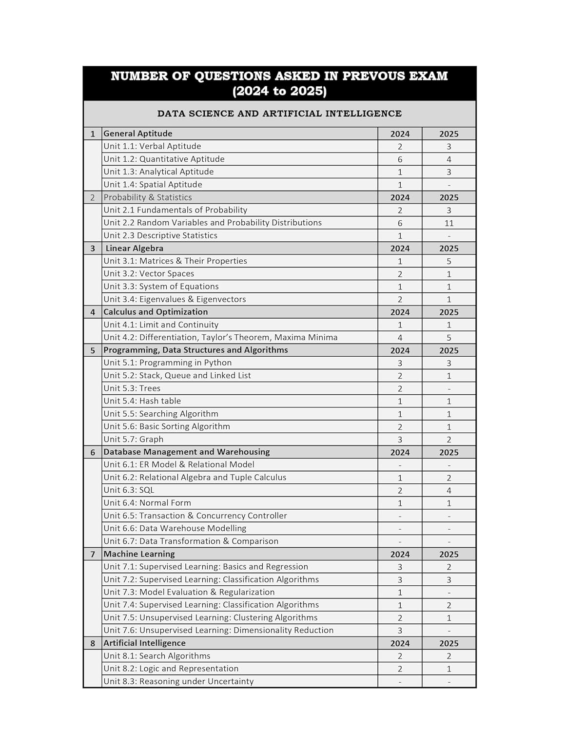 The Questions are sorted as per the updated GATE Data Science and Artificial Intelligence Engineering 2026 syllabus & placed under 8 Topics with Detailed Sub-Topics: