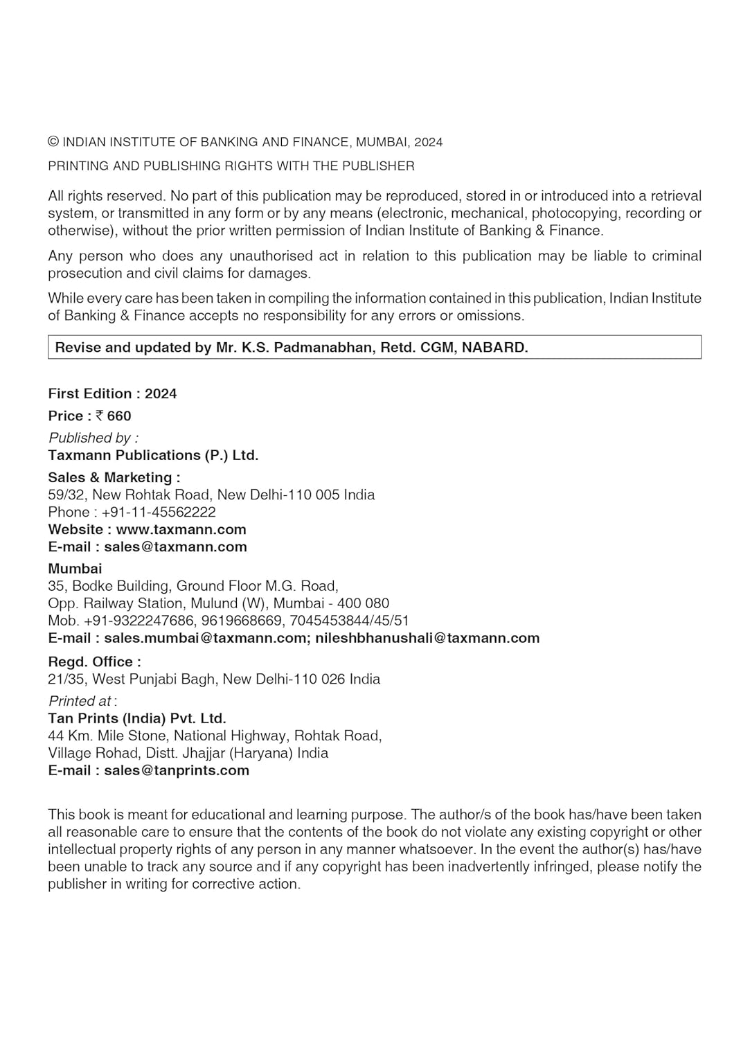 ప్రస్తుత ప్రచురణ 2024 ఎడిషన్, Mr KS పదమ్నాభన్ ద్వారా సవరించబడింది మరియు నవీకరించబడింది | రిటైర్డ్. CGM – నాబార్డ్. టాక్స్మన్ ఈ పుస్తకాన్ని ఇండియన్ ఇన్స్టిట్యూట్ ఆఫ్ బ్యాంకింగ్ అండ్ ఫైనాన్స్ కోసం ఈ క్రింది ముఖ్యమైన లక్షణాలతో ప్రత్యేకంగా ప్రచురిస్తుంది: [భారతీయ బ్యాంకింగ్ నిర్మాణం మరియు బ్యాంకుల రకాలు] ఈ విభాగం భారతీయ బ్యాంకింగ్ వ్యవస్థ యొక్క చట్రాన్ని చర్చిస్తుంది, బ్యాంకింగ్ లో ఇటీవలి పోకడలతో పాటు వివిధ రకాల బ్యాంకులు మరియు వాటి విధులను అన్వేషిస్తుంది. [బ్యాంకింగ్ సేవలు మరియు కార్యకలాపాలు] ఇది వివిధ డిపాజిట్ పథకాలు, ఖాతా తెరిచే విధానాలు, కెవైసి యంత్రాంగాలు మరియు బ్యాంకింగ్ కార్యకలాపాలను చర్చిస్తుంది. రిటైల్ రుణాలపై ప్రత్యేక దృష్టి సారించి అకౌంటింగ్, ఫైనాన్స్ మరియు మంచి రుణ సూత్రాలపై అధ్యాయాలు కూడా ఇందులో ఉన్నాయి. [రిస్క్ మేనేజ్మెంట్ అండ్ రెగ్యులేటరీ ఫ్రేమ్వర్క్స్] బ్యాంకింగ్ కార్యకలాపాలలో ప్రమాదం మరియు మోసం నిర్వహణ యొక్క ప్రాముఖ్యతను నొక్కి చెబుతూ, ఈ పుస్తకం ఆస్తుల వర్గీకరణ, రికవరీ పద్ధతులు మరియు సమగ్ర అంబుడ్స్మన్ పథకాన్ని ప్రస్తావిస్తుంది. [ఆర్థిక చేరిక మరియు బిసి/బిఎఫ్ పాత్ర] ఈ క్లిష్టమైన విభాగం ఆర్థిక చేరిక, బిసి/బిఎఫ్ మోడల్, అటువంటి మోడల్ అవసరం మరియు ఇందులో ఉన్న పాత్రలు మరియు బాధ్యతలను వివరిస్తుంది. ఇది ఆర్థిక చేరికను ప్రోత్సహించే ప్రభుత్వ పథకాలపై కూడా వెలుగునిస్తుంది. [వ్యాపార ప్రతినిధుల కోసం సాంకేతిక నైపుణ్యాలు] మైక్రో ఎటిఎంలు, బయోమెట్రిక్ పరికరాలు, ప్రాథమిక కనెక్టివిటీ సమస్యలు, డిజిటల్ బ్యాంకింగ్ ఉత్పత్తులు మరియు డిజిటల్ బ్యాంకింగ్ లో ఇటీవలి పరిణామాలను ఎలా నిర్వహించాలో ఈ విభాగం పాఠకులకు అర్థం చేస్తుంది. [మృదువైన నైపుణ్యాలు మరియు ప్రవర్తనా అంశాలు] సంబంధాల నిర్మాణం, సంప్రదింపుల నైపుణ్యాలు, వివిధ రకాల వినియోగదారులతో వ్యవహరించడం మరియు రుణ రికవరీ కోసం వ్యూహాలతో సహా వ్యాపార ప్రతినిధులకు సాఫ్ట్ స్కిల్స్ యొక్క ప్రాముఖ్యతను ఈ పుస్తకం నొక్కి చెబుతుంది.