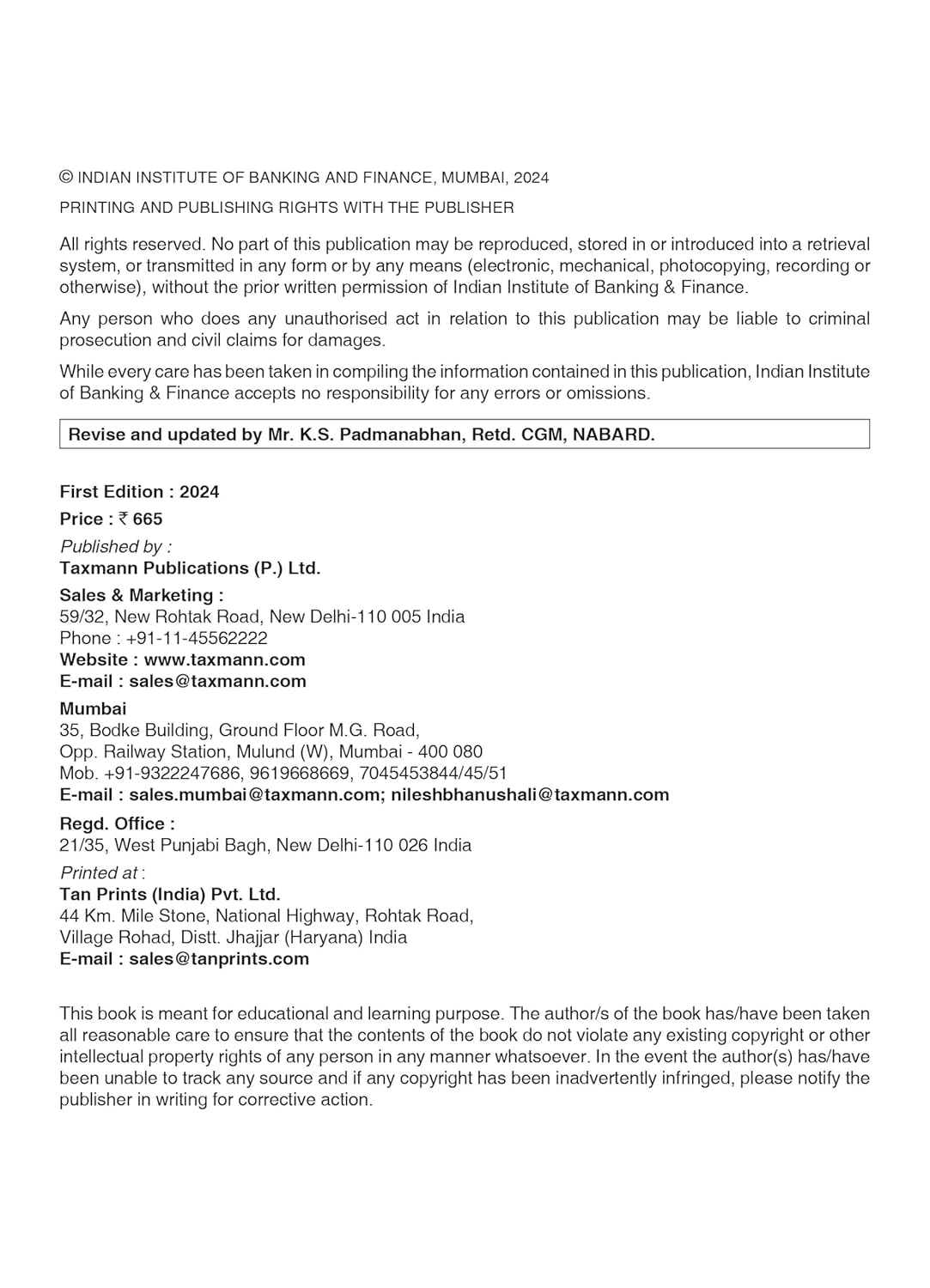 Mr. K.S പദ്മനാഭൻ പരിഷ്കരിച്ചതും അപ്ഡേറ്റ് ചെയ്തതുമായ 2024 പതിപ്പാണ് ഇപ്പോഴത്തെ പ്രസിദ്ധീകരണം. പത്മനാഭൻ | റിട്ട. സിജിഎം-നബാർഡ്. താഴെപ്പറയുന്ന ശ്രദ്ധേയമായ സവിശേഷതകളോടെ ഇന്ത്യൻ ഇൻസ്റ്റിറ്റ്യൂട്ട് ഓഫ് ബാങ്കിംഗ് ആൻഡ് ഫിനാൻസിനായി ടാക്സ്മാൻ ഈ പുസ്തകം പ്രത്യേകമായി പ്രസിദ്ധീകരിക്കുന്നുഃ[സാമ്പത്തിക പ്രാധാന്യം] ബാങ്കിംഗ് സേവനങ്ങളുമായി ബാങ്കില്ലാത്ത ജനങ്ങളെ ബന്ധിപ്പിച്ച് ഇന്ത്യയുടെ ഗ്രാമീണ സമ്പദ്വ്യവസ്ഥയെ പിന്തുണയ്ക്കുന്നതിൽ ബിസി/ബിഎഫ് മോഡലിന്റെ പങ്ക് ഊന്നിപ്പറയുന്നു[ബിസി/ബിഎഫ് മോഡലിന്റെ ലക്ഷ്യം] ഒഴിവാക്കപ്പെട്ട വ്യക്തികളിലേക്ക് എത്തിച്ചേരുന്നതിലും ബാങ്ക് ശാഖകളില്ലാത്ത പ്രദേശങ്ങളിൽ ബാങ്കിംഗ് സേവനങ്ങൾ വാഗ്ദാനം ചെയ്യുന്നതിലും ബിസി/ബിഎഫ് മോഡലിന്റെ ഉദ്ദേശ്യം വിശദീകരിക്കുന്നു. [പ്രവർത്തനപരമായ അപകടസാധ്യതകളും നൈപുണ്യ ആവശ്യകതകളും] ബി. സികളെ ഇടപഴകുന്നതിൽ ബാങ്കുകൾക്ക് ഉൾപ്പെടുന്ന പ്രവർത്തനപരവും പ്രശസ്തവുമായ അപകടസാധ്യതകളും ഫലപ്രദമായ പ്രകടനത്തിന് ആവശ്യമായ നൈപുണ്യ സെറ്റുകളും ചർച്ച ചെയ്യുന്നു.