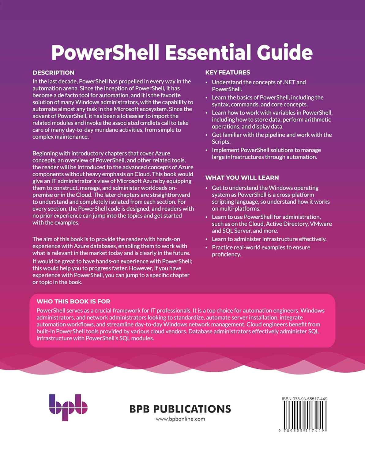 Beginning with introductory chapters that cover Azure concepts, an overview of PowerShell, and other related tools, the reader will be introduced to the advanced concepts of Azure components without heavy emphasis on Cloud. This book would give an IT administrator’s view of Microsoft Azure by equipping them to construct, manage, and administer workloads on-premise or in the Cloud. The later chapters are straightforward to understand and completely isolated from each section. For every section, the PowerShell code is designed, and readers with no prior experience can jump into the topics and get started with the examples.
